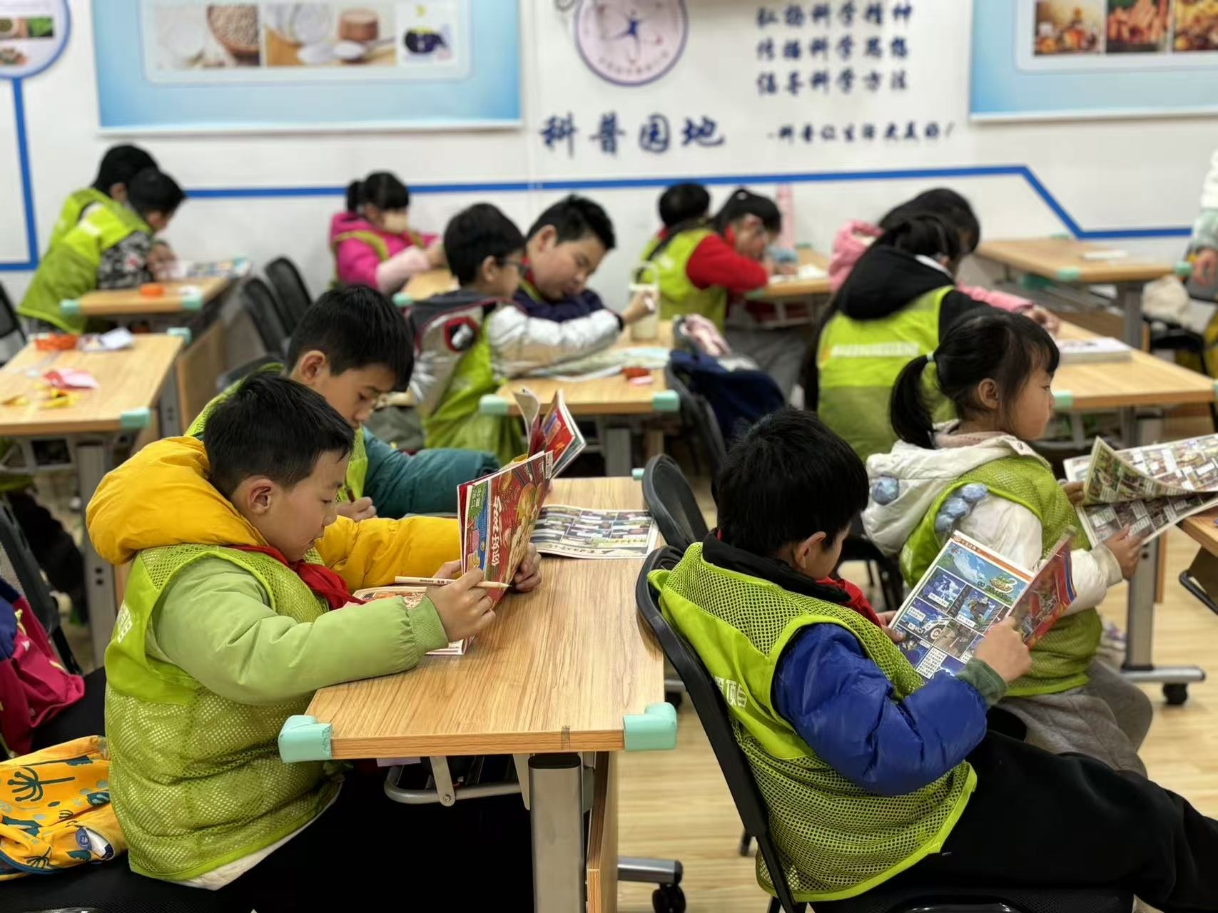 除了折纸课以外,还有垃圾分类课程和消防课。上完课之后,老师们会带着孩子们阅读,或者辅导作业。孩子们阅读兴致很高,争着抢着拿书,然后坐下来阅读。