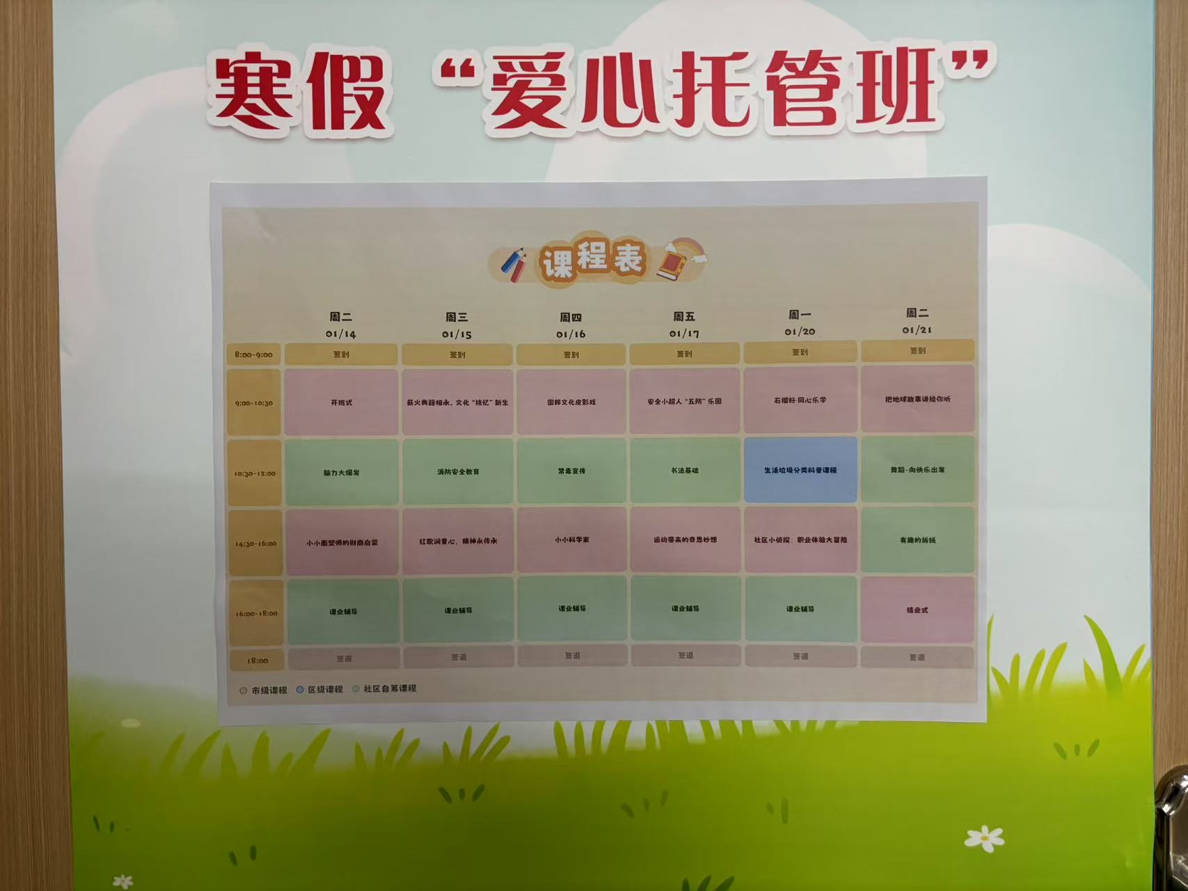 在两个寒托班现场,记者都看到墙上张贴了课表。其中有相同的10节课,来自面向全市所有在汉高校开展的课程征集。例如“国粹文化皮影戏”“小小科学家”“社区小侦探:职业体验大冒险”“运动带来的奇思妙想”等趣味课程,涵盖品德修养、科学素养、体育锻炼、美育熏陶、劳动教育、安全自护等六大课程体系,引入国家安全、垃圾分类、心理健康等部门资源,寒假期间可实现托管班市级课程全覆盖。